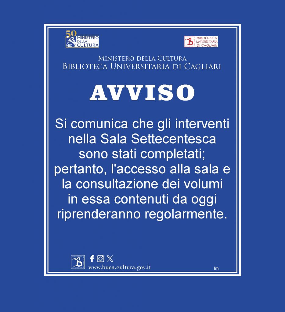 La Sala Sarda, a causa di problemi strutturali, continua a non essere accessibile. Ricordiamo pertanto che i volumi con collocazione da